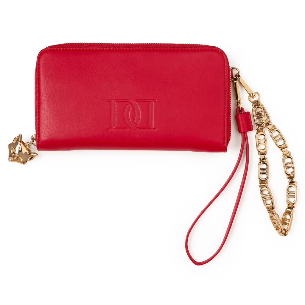 The trendy wallet even provides two stylish options of wristlets that allow versatility. The meticulous detail is unforgettable following a gold metal foxhead zipper pull. It is available in various colors such as red, pink, brown, and black.